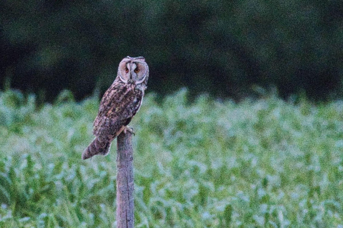 Glücklicherweise setzte er sich auf einen Pfahl etwa 150 Meter vor mir. Ich drückte den Auslöser. Die Waldohreule schaute direkt in meine Richtung. Ich drückte nochmal ab. Sie wartete noch einen Moment, dann flog sie so leise davon, wie sie gekommen war."