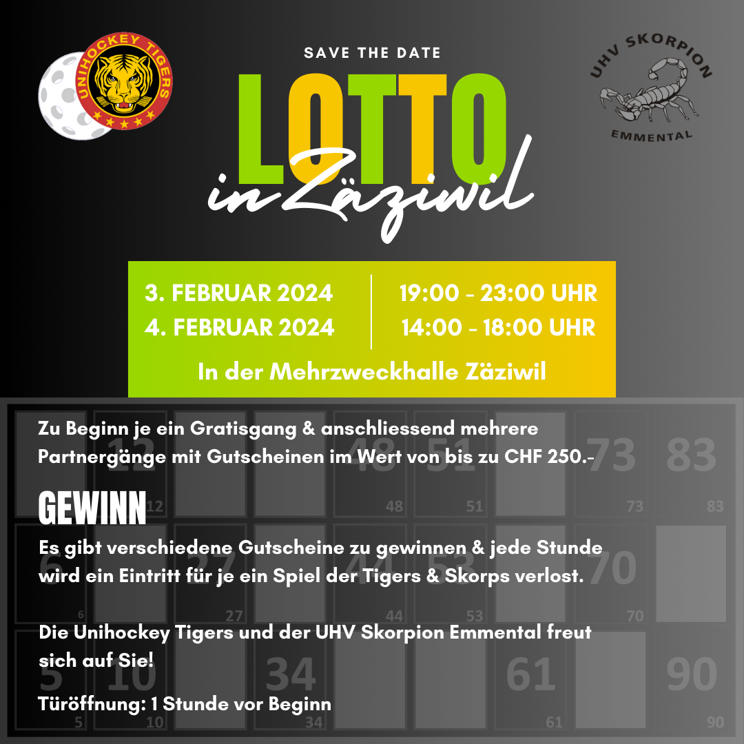 Lotto in Zäziwil! Die beiden Unihockeyvereine Unihockey Tigers und UHV Skorpion Emmental laden herzlich zum Lottomatch ein. Gestartet wird mit einem Gratisgang. Anschliessend mehrere Partnergänge mit Preisen im Wert von bis zu CHF 250.-- sowie Verlosungen von Heimspieltickets jede Stunde. Türöffnung um 18.00 Uhr.