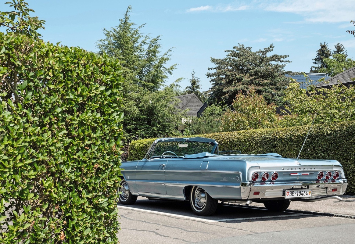 Bäume sind auch in lebendem Zustand Motive,für die sich Jürg Ramseier interessiert. Beim Herumgehen in Münsingen fand er Nadelbäume im Wetteifer mit dem spitzen Kirchturm, Palmen in Vorgärten und im Open-Air Kino, Kastanien wie Baldachine über dem Güggeli-Take-away. Grün dominiert; fast verschlucken die Hecken zwischen den Einfamilienhäuschen den Amischlitten mit Berner Nummernschild, der brav in seinem Parkfeld steht. Ein Chevrolet-Cabrio. Himmelblau, mit geöffnetem Verdeck. Abgesehen davon blitzt nirgendwo der amerikanische Traum auf – im satten Schweizer Dorf, dem der Gemeindepräsident im Vorwort "die richtige Mischung zwischen ländlichem Charme und städtischer Vielfalt" attestiert, hat man alles schon erreicht. Was bleibt, ist das Aufbrechen und Weggehen.