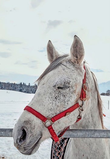Es ist Winter auf diesem Buchcover. Schnee liegt, ein Streifen schwarzer Wald begrenzt den Blick, drüber ein Himmel in Weiss und Grau. Und auch das Pferd im Vordergrund ist weiss und grau, einApfelschimmel mit rotem Zaumzeug. Fast streckt es den Kopf aus dem Bild heraus und stupst die Betrachtenden an mit seinenweichen Nüstern. Will es einem Tierkalender entspringen? Aber nein – da steht ja, in fast beiläufig kleiner Schrift oben links: "Mein Münsingen. Fotografien Jürg Ramseier". Und das Pferd will gar nichts, es schläft. Schläft es? Oder war das bloss ein Lidschlag, ein kurzes Augenschliessen, das der geistesgegenwärtige Fotograf erwischt hat? Je länger man schaut, desto rätselhafter wirkt das Bild.
