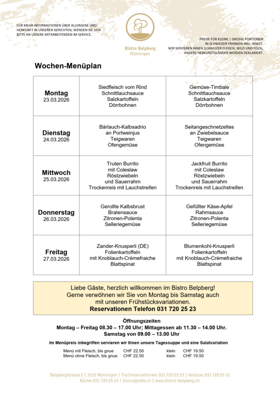 Bitte voranmelden bis spätestens 11 Uhr --> Telefon 031 720 25 23.