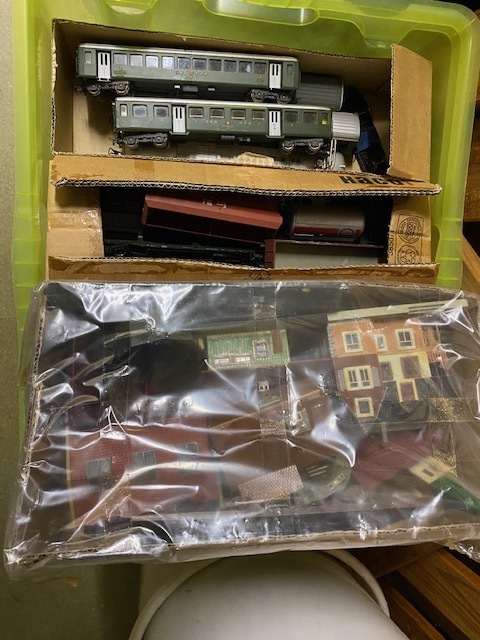 Eisenbahnwagen zum Teil def. von verschiedenen Marken, Häuser, Bastelmaterial für Landschaftsgestaltung,