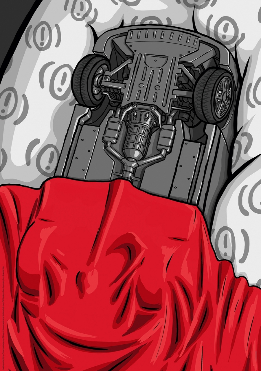 Das Plakat zeigt ein Auto, das auf dem Dach, weich gebettet, unter einer roten Decke liegt. Das Kissen zieren Bremssymbole, Ausrufezeichen in Klammern. „Das Motiv hat etwas Lustiges, ein Auto sieht man sonst nicht auf dem Rücken“, sagt Damin.