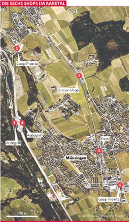Die beiden Coop-Pronto-Shops sind nur etwa drei Kilometer Luftlinie voneinander entfernt. Kann das gutgehen? «Die Shops in Münsingen und Rubigen liegen an zwei völlig verschiedenen Verkehrsströmen. Deshalb laufen sie gut», sagt Jürg R. Kretzer, Mediensprecher der Coop Mineraloel AG. Er betont, dass es anderswo Standorte gebe, an denen Coop-Pronto-Shops noch näher beieinanderlägen als im Aaretal.