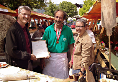 Christoph Maurer macht seine Oeko-Pizza jeweils am Samstag Vormittag auf dem Münsinger Wochenmarkt auf dem "Trauben"-Platz. Die Goldmedaille wurde ihm verliehen, weil seine Pizza ausschliesslich aus Produkten der Region respektive des Wochenmarkts besteht.