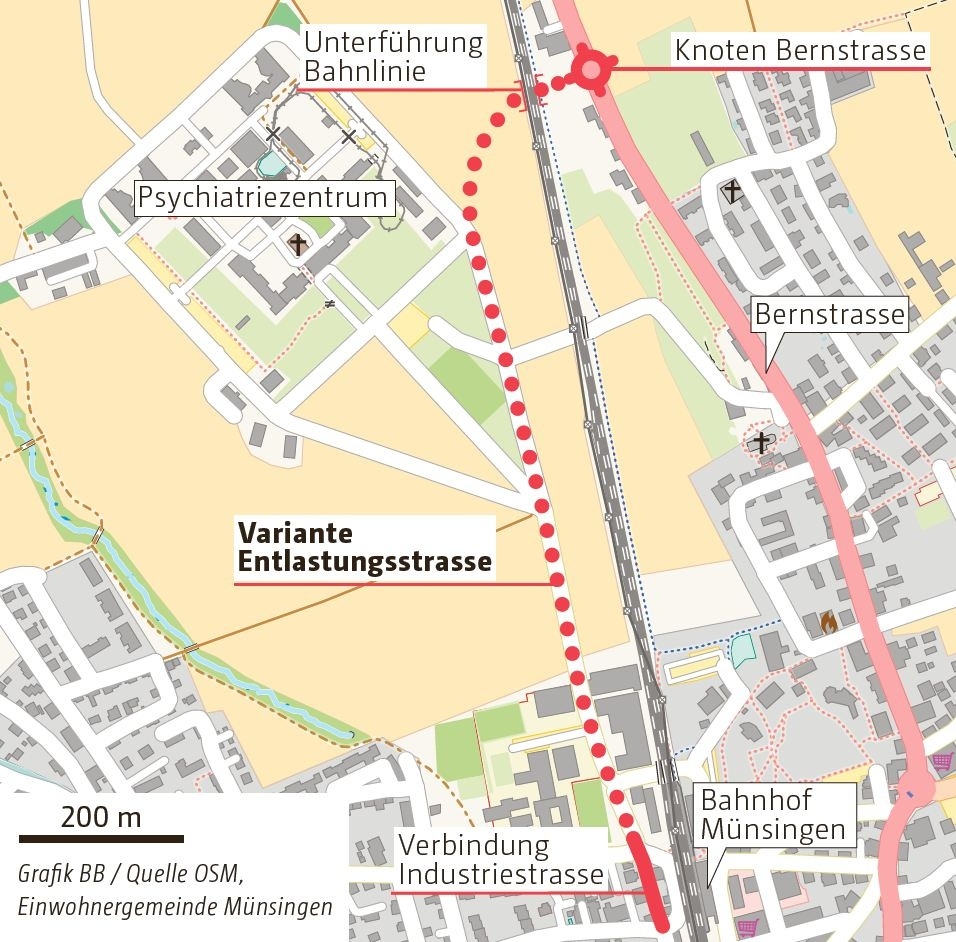Die Münsinger Ortsdurchfahrt ist bekannt für Staus, Schneckentempo und genervte Autofahrer. Der Verkehr nimmt stetig zu. Nach einer Lösung für das Verkehrsproblem wird seit langem erfolglos gesucht. So erwies sich ein Autobahnanschluss im Süden der Gemeinde als Utopie. Und im letzten Sommer zerzauste das Parlament die gemeinderätliche Idee einer einspurigen Strasse entlang der Autobahn. So bleibt die geplante Strasse, die vom nördlichen Dorfrand in den Ortsteil West führt. Sie beginnt an der Bernstrasse, führt unter der Bahnlinie hindurch und am Psychiatriezentrum vorbei auf die Hunzigenstrasse. Schliesslich gelangt sie über eine neue Verbindung in die Industriestrasse (siehe Karte).
