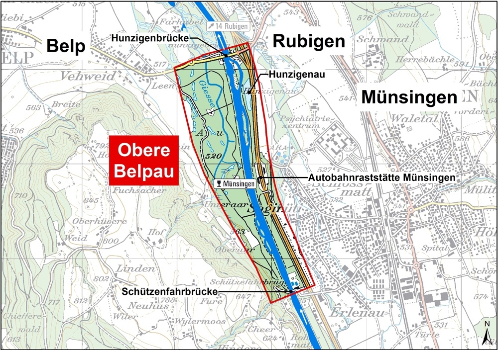 Das Gebiet des Wasserbauplans Obere Belpau liegt auf dem Gemeindegebiet von Belp, Münsingen und Rubigen. Es erstreckt sich von der Schützenfahrbrücke beim Schwimmbad Münsingen bis zur Hunzigenbrücke bei der Autobahnzufahrt Rubigen.