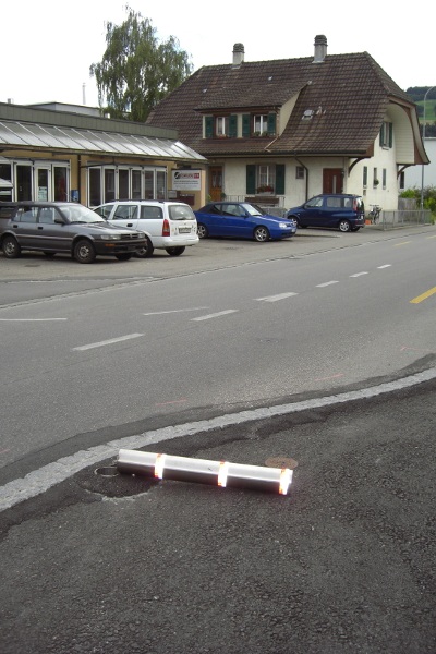 Am vergangenen Wochenende erlitt das Unterdorf Münsingen erheblichen Schaden an den Verkehrsentschleunigungs-Pfosten. Einzig ein Poller stand noch an seinem Platz.