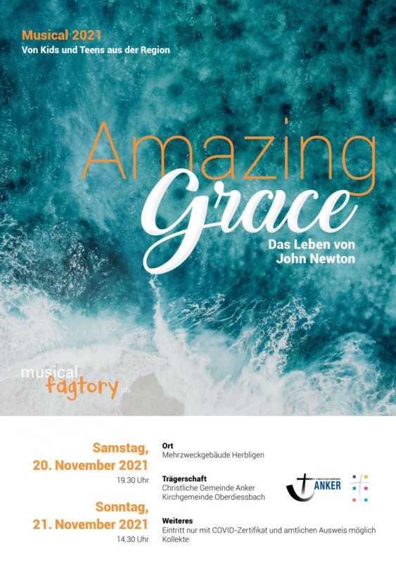 Ein Musical von der Musicalfägtory mit den Kids und Teens aus der Region Oberdiessbach. Das Musical "Amazing Grace" basiert auf einer wahren Geschichte. Es geht um die Lebensgeschichte von John Newton. Aufgeführt wird das Musical von motivierten Kids und Teens aus der Region!