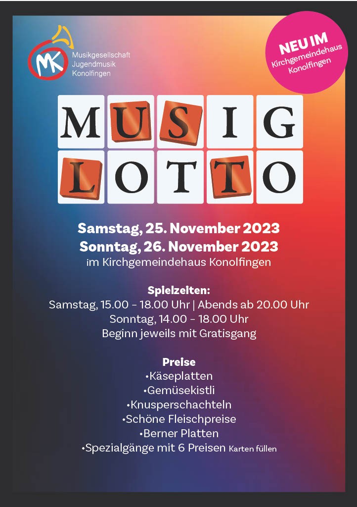 Das Musig-Lotto der Musikgesellschaft und Jugendmusik Konolfingen findet neu im Kirchgemeindehaus Konolfingen statt.