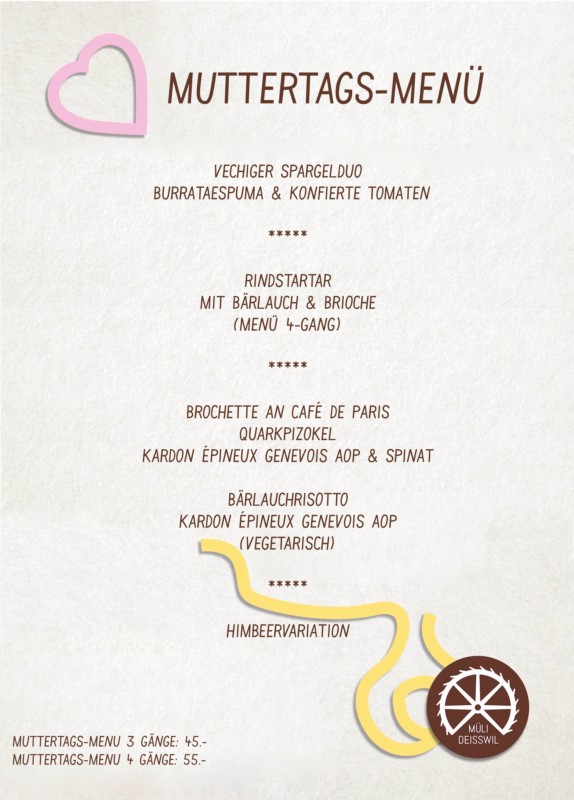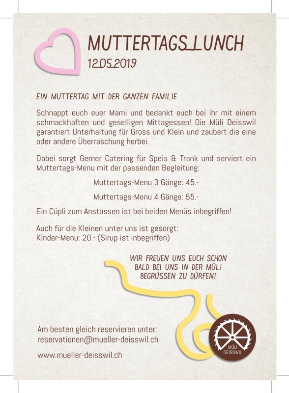 Schnappt euch euer Mami und bedankt euch bei ihr mit einem schmackhaften und geselligen Mittagessen! Die Müli Deisswil garantiert Unterhaltung für Gross und Klein und zaubert die eine oder andere Überraschung herbei.