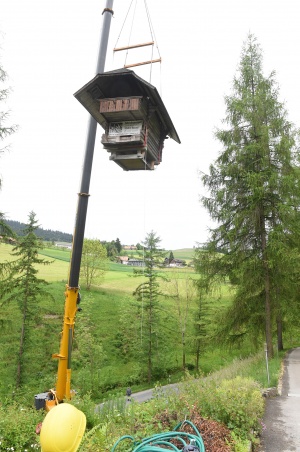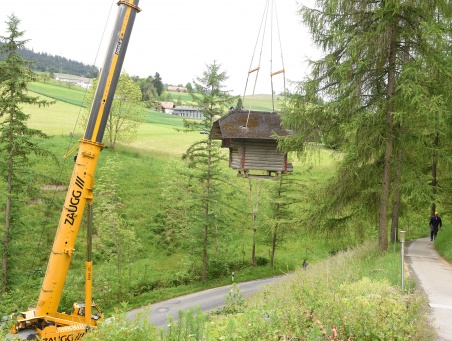 Im Juni 2013 drohte der alte Spycher beim Hotel Appenberg abzustürzen. Er musste abtransportiert werden. Am Montag Vormittag nun wurde der Spycher mit einem riesigen Kran wieder (fast) an seinen alten Platz gestellt.