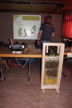 Der attraktive und spannende Vortrag und die anschliessende Information rund um den Bienenschaukasten brachten die Kinder zum Staunen. Kompetent beantwortete Kurt Krähenbühl die Fragen. So leben nun fortan bis zu den Sommerferien die 2‘000 Bienen im Schulzimmer.