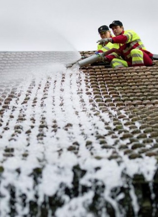 Zwei Feuerwehrmänner schleppen den orangen Schlauch über die Wiese durch das Tenn, und ziehen ihn durch eine Lücke aufs Dach. Daniel Thierstein setzt die Motorspritze in Gang. Mit Getöse saugt sie Wasser aus einem unterirdischen Feuerweiher. Kommandant Bernhard Zürcher dosiert den Druck im Schlauch. Hans Burger und Andreas Jenni halten auf dem Dach den Schlauch so, dass das Wasser breitflächig über die Ziegel fliesst.