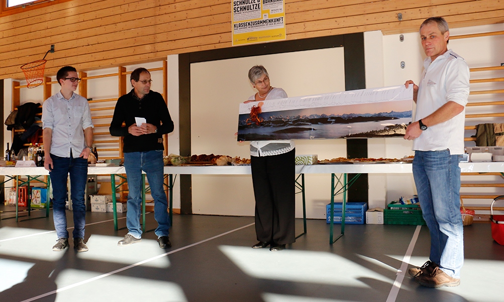 Neben einer Urkunde erhielt Oswald auch ein Panoramabild von Oberthal mit Ausblick auf die Alpen. Die rund zwei Meter lange Fotografie machte der bekannte und bereits verstorbene Oberthaler Fotograf Peter Studer in den Siebzigern.