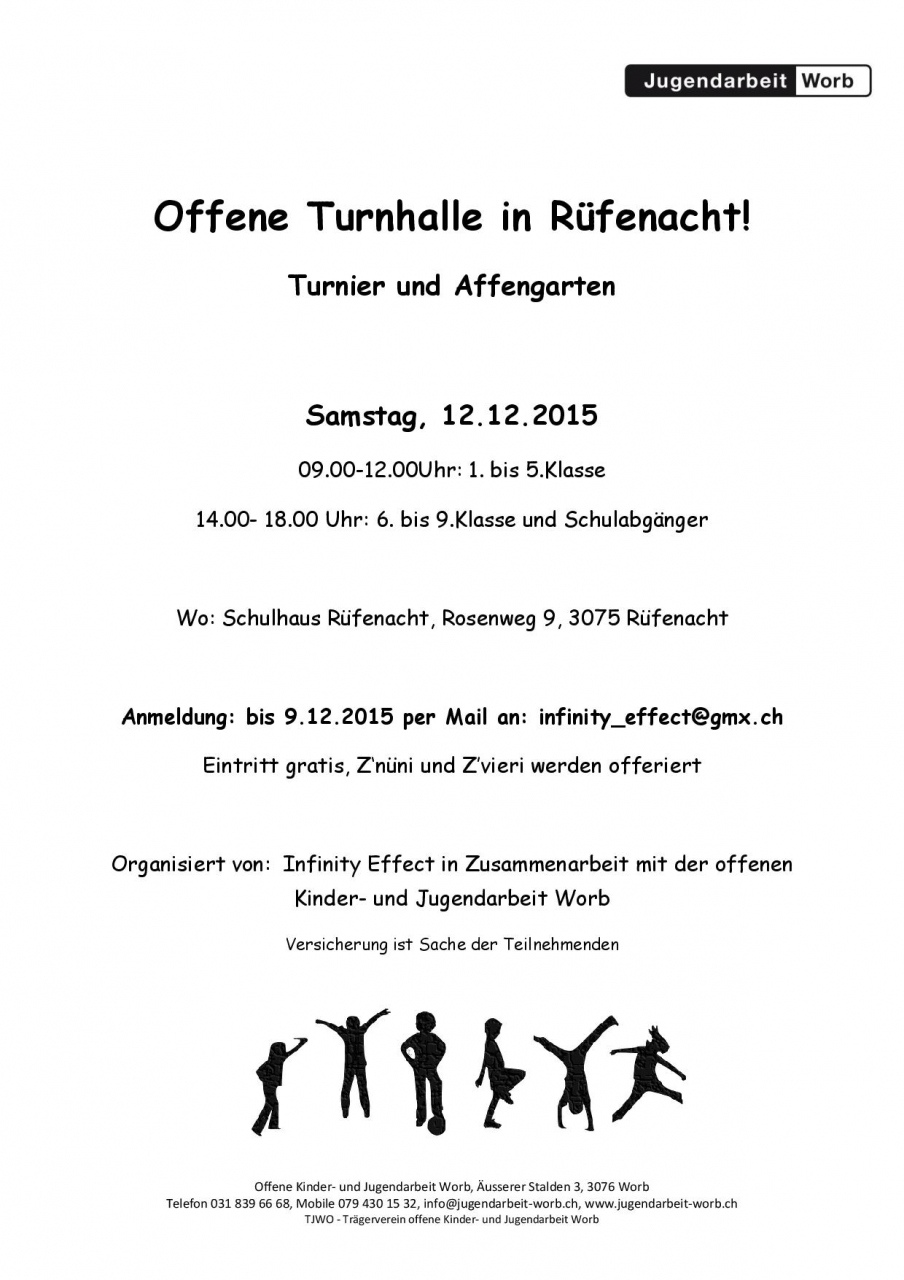 Die offene Kinder- und Jugendarbeit Worb organisiert am 12.12.15 zusammen mit der Jugendgruppe Infinity Effect in der Turnhalle Rüfenacht ein offenes Spielangebot. Von 9.00- 12.00 Uhr für alle von der 1. bis zur 5. Klasse, Ab 14.00- 18.00 Uhr für alle ab der 6. Klasse bis und mit Schulabgänger. Der Eintritt ist frei und die Jugendarbeit offeriert ein Z`nüni/Z`vieri.