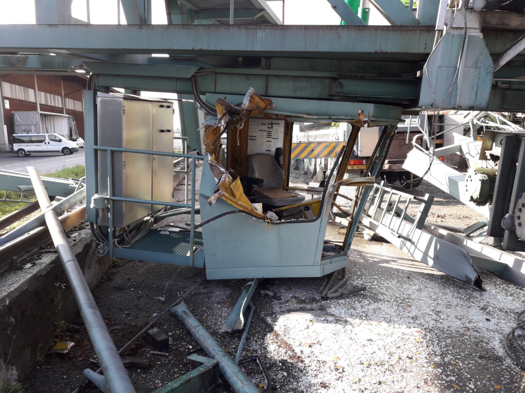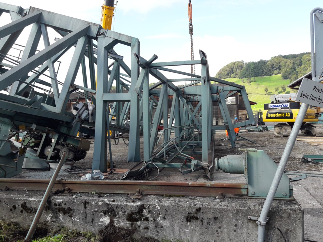 Als erstes musste der Kran gewogen werden. Dafür wurde er an jedem Ende kurz angehoben. Pro Fuss war das Gewicht 13 Tonnen, insgesamt 52 Tonnen. Danach musste die Platzlogistik organisiert werden: Wo kommen die Kräne zu stehen, damit sie das grosse Gewicht tragen mögen? Am Montagmorgen dann schliesslich die Hauptarbeit: Anheben des gesamten Krans, zerlegen mit der Schrottschere und Abtransport des Alteisens.