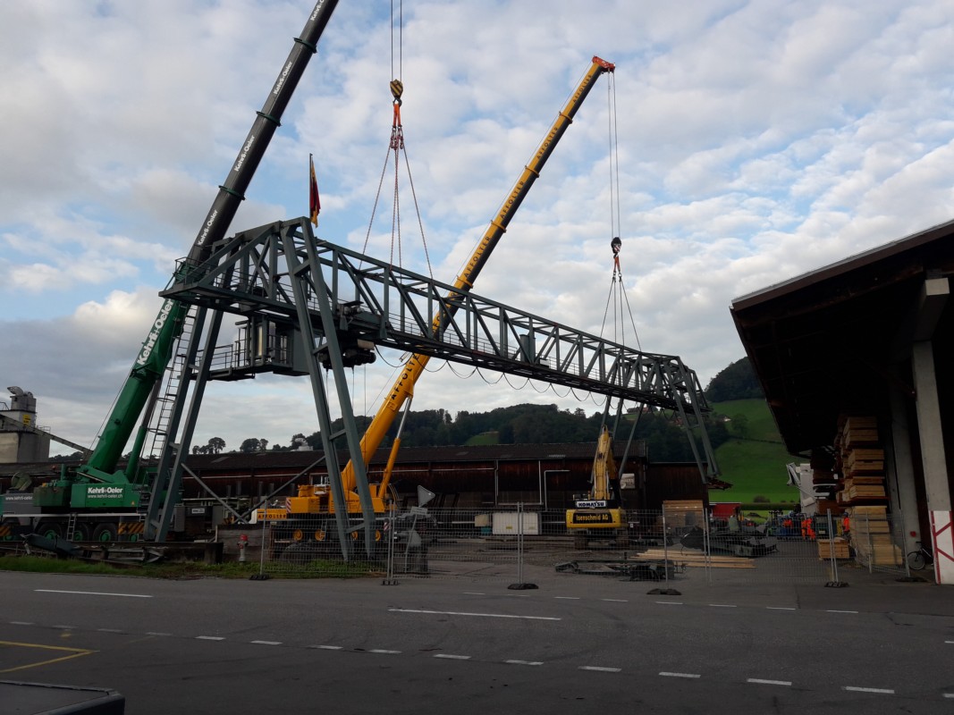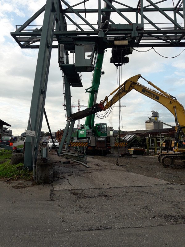 Am Montag wurde der alte Portalkran auf dem Gelände der OLWO Worb abgerissen. Die 52 Tonnen Stahl waren schneller weg als geplant. Ersetzt wird der Kran durch einen 35 Tonnen schweren Bagger.