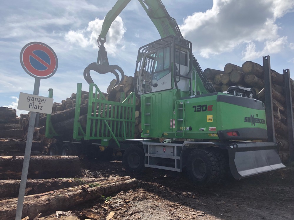 Der Portalkran wird ersetzt durch einen 35 Tonnen schweren Umschlagbagger, ein Radbagger mit Anhänger und Greifer, der vollgeladen gar 60 Tonnen wiegt. "Damit sind wir flexibler und gerüstet für die Zukunft", so Lädrach. Rund 250 m3 Holz werden in der OLWO pro Tag verarbeitet. Da der Maschinist jeden Baumstamm zweimal umplatzieren muss, einmal von der Transportbox in die Lagerbox und danach von dort in die Sägerei, bewegt der neue Bagger so jeden Tag um die 500 m3 Holz.