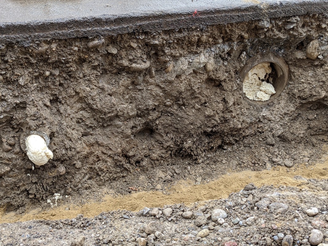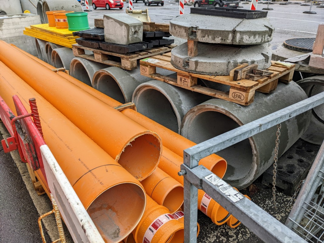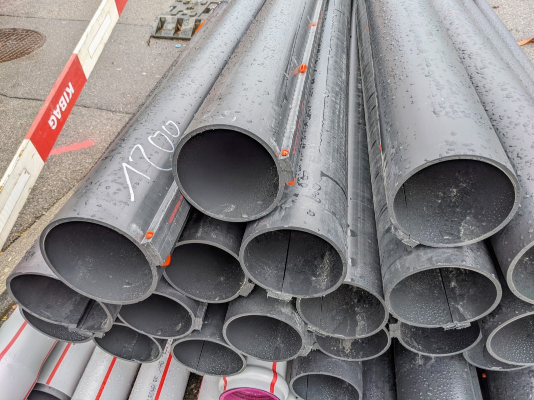An diesem Nachmittag sind zwei Bauarbeiter am westlichen Rand der Baustelle mit dem Einsetzen von Kunststoffrohren beschäftigt. Diese umgeben sie mit Sand. "Sonst kann es durch grosse Steine zu Druck kommen, was die Rohre beschädigen könnte." In der Baugrube sind auch alte Blechrohre zu sehen. Sie sind verrostet. "Darum nimmt man heute Kunststoff."