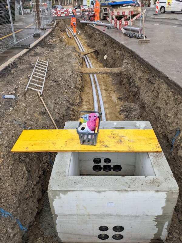 Eines der Rohre, das die beiden Arbeiter verlegen, muss an einen bestehenden Schacht angeschlossen werden. "Dafür müssen wir eine Kernbohrung machen", sagt einer der beiden. Die anderen beiden Rohre sind bereits an einen neuen Schacht angeschlossen, der als Ganzes in die Baugrube gestellt wurde. "In diesen Schächten kann man die Kabel verschlaufen", sagt Gygli. Heisst: Indem man die Kabel in eine Schlaufe legt, können sie die Richtung wechseln, ohne geknickt und gespannt zu werden.