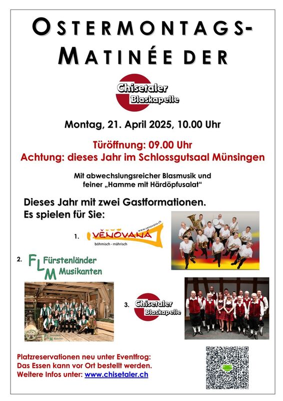 Am Ostermontag, 21.04.2025, findet das traditionelle Matinée-Konzert der Chisetaler Blaskapelle statt. Die Türöffnung ist um 09.00 Uhr, der Start um 10.00h. Dieses Jahr sind sogar 3 Kapellen dabei.