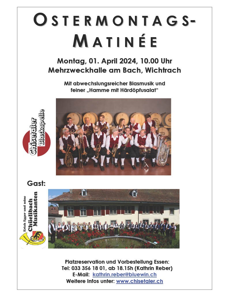 Am 01.04.2024 findet unser traditionelles Ostermontags-Matinée-Konzert statt. Zu Gast sind dieses Jahr die Chüelibach Musikanten.