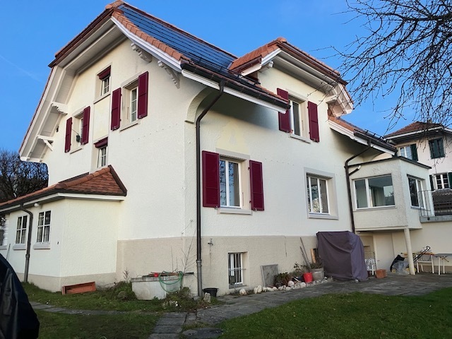 frisch renovierte 4 Zimmerwohnung in Zweifamilienhaus mit grosser Terrasse, Wintergarten und Gartenanteil, Garage, Wärmepumpe, Solardach. Unverbaubare Bergsicht