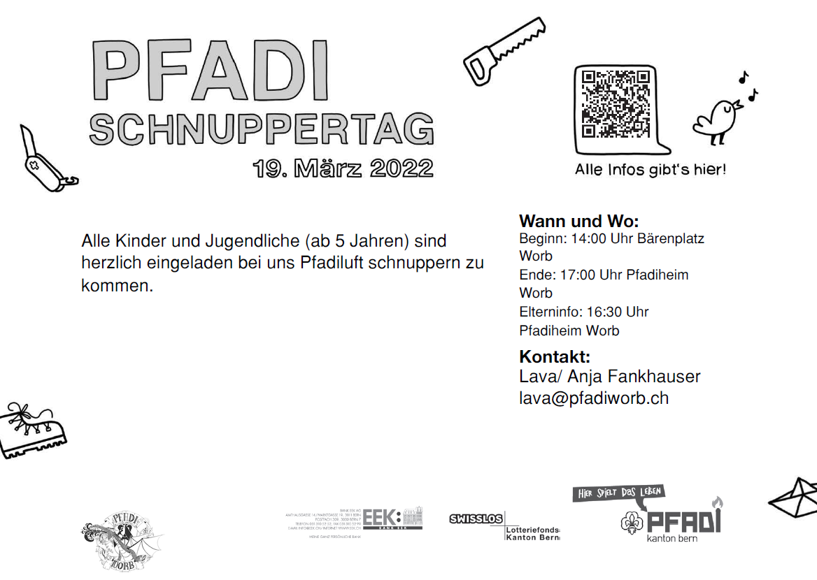 Für interessierte Eltern findet von 16:30 bis 17:00 Uhr im Pfadiheim Worb ein kurzer Info- Anlass, über unsere Pfadi und alles was sie sonst noch wissen möchten, statt.
