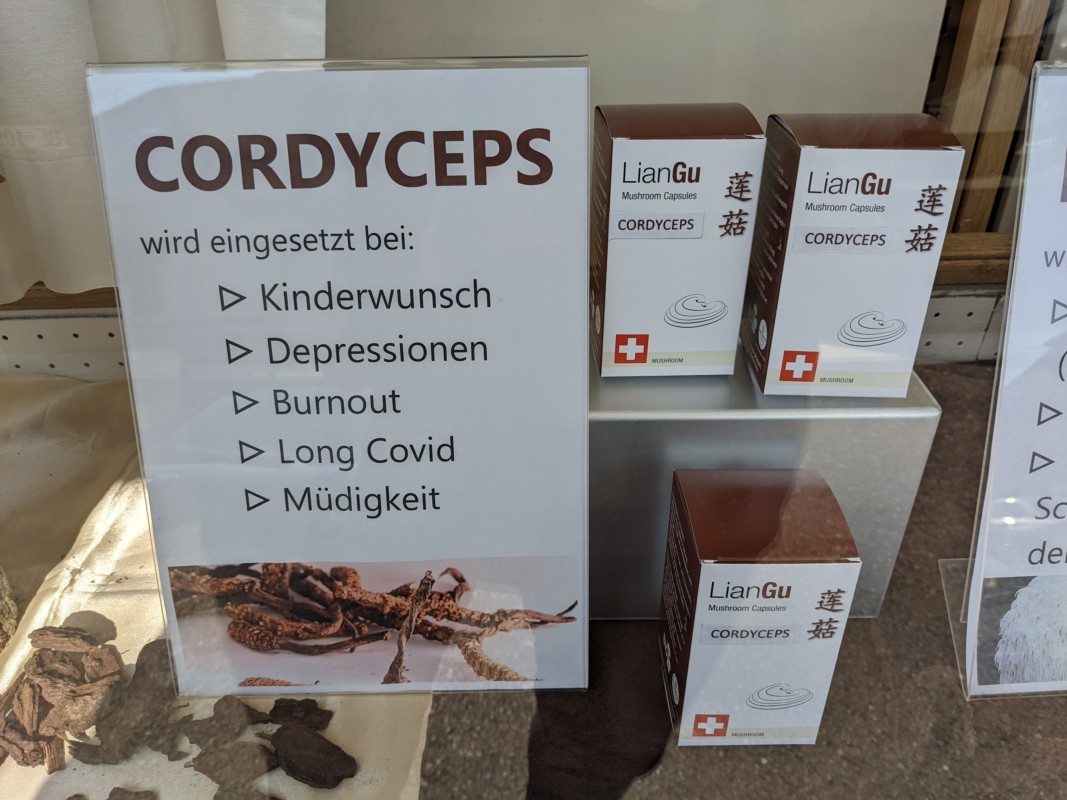 Beim Pilz handelt es sich um den Raupenpilz oder lateinisch Cordyceps. Mit letzterem Namen wird er auf dem Präparat der Schweizer Herstellerin Lian Gu benannt, das in Worb verkauft wird. Nadia Minder stellt klar: "Dieser Pilz hilft einfach gegen ein Symptom von Long Covid, nämlich die extreme Müdigkeit mit Konzentrationsschwierigkeiten. Er wird nicht nur bei Long Covid, sondern zum Beispiel auch bei Burnout eingesetzt."