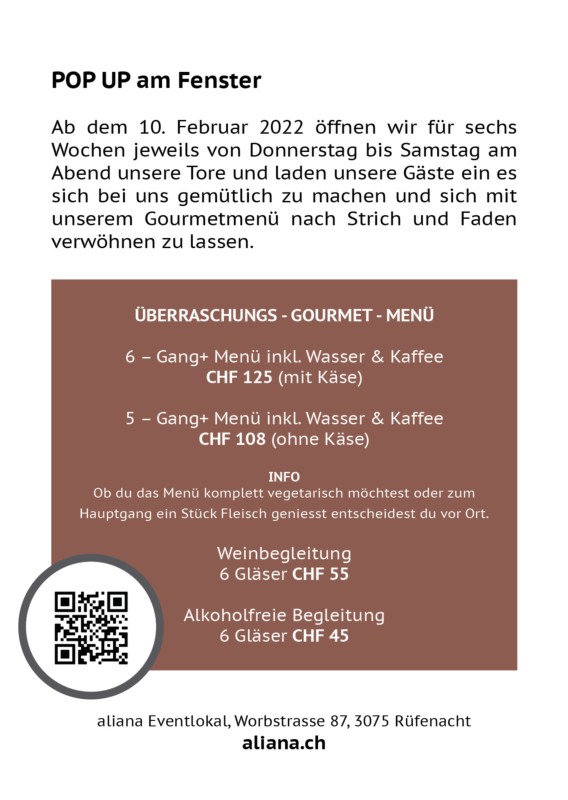 "Ab dem 10. Februar 2022 öffnen wir für sechs Wochen jeweils von Donnerstag bis Samstag am Abend unsere Tore und laden unsere Gäste ein es sich bei uns gemütlich zu machen und sich mit unserem Gourmetmenü nach Strich und Faden verwöhnen zu lassen."