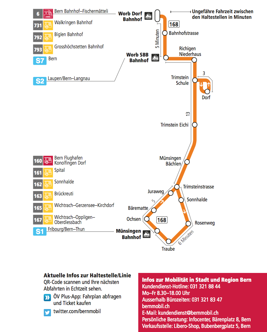 [i] Am Sonntag, 9. Dezember findet für die Linie 168 in Trimstein eine Eröffnungsfeier bei der Turnhalle Trimstein mit Speis und Trank sowie Spielen statt. Es fährt ein Gratis-Shuttlebus ab Münsingen Bahnhof und Worb Dorf Bahnhof nach Trimstein.