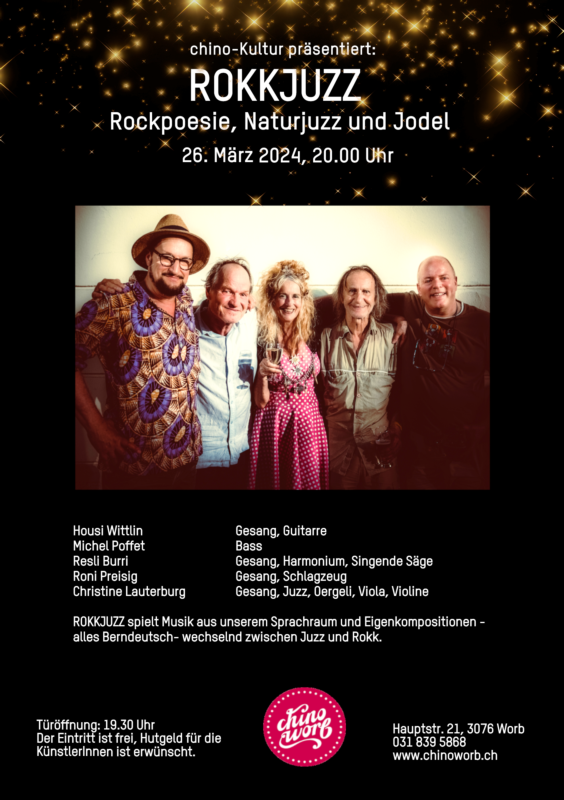 Am 26. März lädt das chinoworb zum ROKKJUZZ-Abend ein, bei dem altbekannte Künstlerinnen und Künstler auf der Worber Bühne brillieren werden. Die Band, bestehend aus Christine Lauterburg, Housi Wittlin, Michel Poffet, Resli Burri und Roni Preisig präsentiert einen Mundart-Mix aus Rockpoesie, Naturjuzz und Jodel, ein spannender Spagat zwischen Schweizer Musiktradition und modernen Musikformen.
