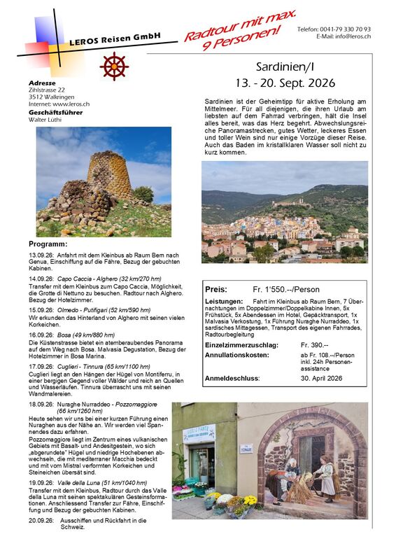 Leistungen: Fahrt im Kleinbus ab Raum Bern, 7 Übernachtungen im Doppelzimmer/Doppelkabine Innen, 5x Frühstück, 5x Abendessen im Hotel, Gepäcktransport, 1x Malvasia Verkostung, 1x Führung Nuraghe Nurraddeo, 1x sardisches Mittagessen, Transport des eigenen Fahrrades, Radtourbegleitung