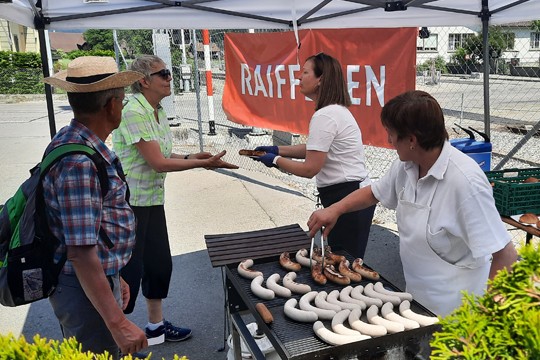 Bei sonnigem Wetter und gar heissen Temperaturen trafen die ersten Wanderer bereits nach einer Stunde an den Zielorten Deisswil und Worb ein. Zur Stärkung reichten Raiffeisenmitarbeitende Bratwürste und Brot sowie Getränke. Zum Schluss genossen die Teilnehmenden ein Kaffee begleitet von einem speziell hergestellten RAIFFEISEN-Spitzbub.
