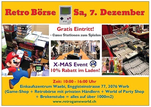 X-MAS Event mit 10% auf Ladenprodukte! Zusätzliche Retrobörse mit privaten Händlern! Riesiges Arsenal an Merchandise, Verkleidungen (Cosplay) im World of Party-Shop und Sachen zum Stöbern zusätzlich in der Brockenstube im selben Gebäude!