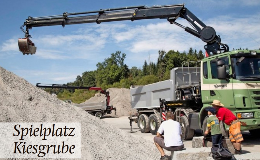 Schon auf dem Weg zur Kiesgrube hallen die hellen Kinderstimmen herüber, noch bevor das grosse Gelände in Sichtweite ist. Auf dem Areal angekommen, erblickt man zuerst einen riesigen gedeckten Sandkasten, auf welchem fleissig herumgewuselt und gebaut wird. Daneben sitzen viele Eltern Eis essend im Schatten und schauen entspannt zu, die Stimmung ist sehr friedlich.