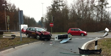 Bevor das Auto auf der gegenüberliegenden Autobahnauffahrt wieder zum Stillstand kam, kollidierte es mit einem zweiten Kandelaber mit Lichtsignalanlage und Wegweisern.