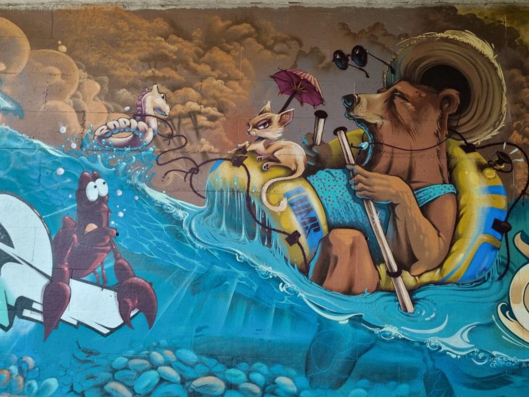 Doch bevor zur Spraydose gegriffen werden konnte, musste der Bauer seine Geräte wegstellen und «die harmlosen Zehn» musste sich ein Thema überlegen. «Normalerweise entscheiden wir uns spontan für ein Oberthema und die Farbgestaltung. Dieses Mal aber sind wir zusammengesessen und haben Ideen gesammelt.» Was alle verbindet und auch zum Ort passt, wurde zum Thema: «Irgendwann sind wir dann auf die Aare gekommen: Sie verbindet Thun und Bern, und die Brücke führt über die Aare. So wurde ‘Die Aare unter und über dem Wasser’ zum Thema».