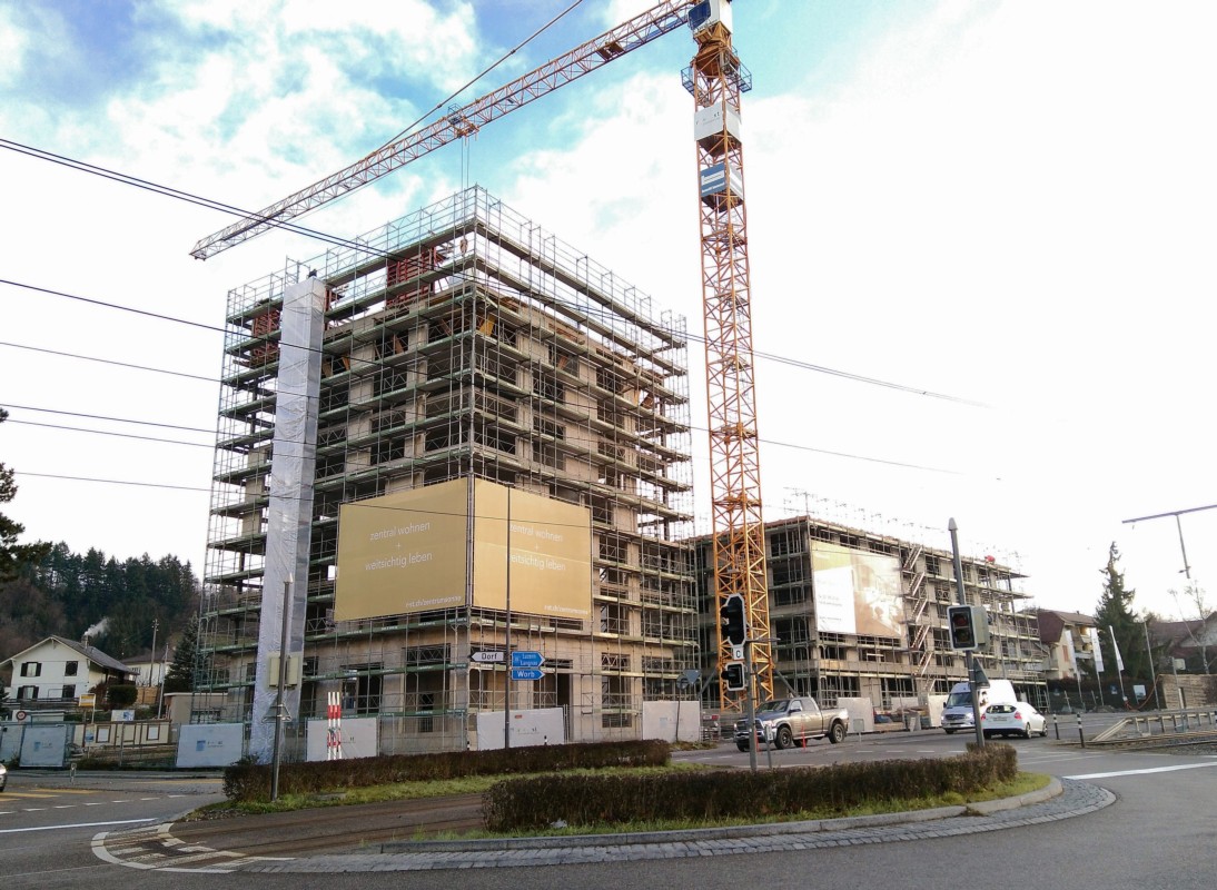 Langsam zeigt sich, wie es dereinst in Rüfenacht aussehen wird. Besonders das markante achtstöckige Hochhaus am Kreisel prägt die Rüfenachter Skyline. Hangwärts wird sich der neue Dorfplatz erstrecken. Noch stehen dort Baumaschinen und -material.