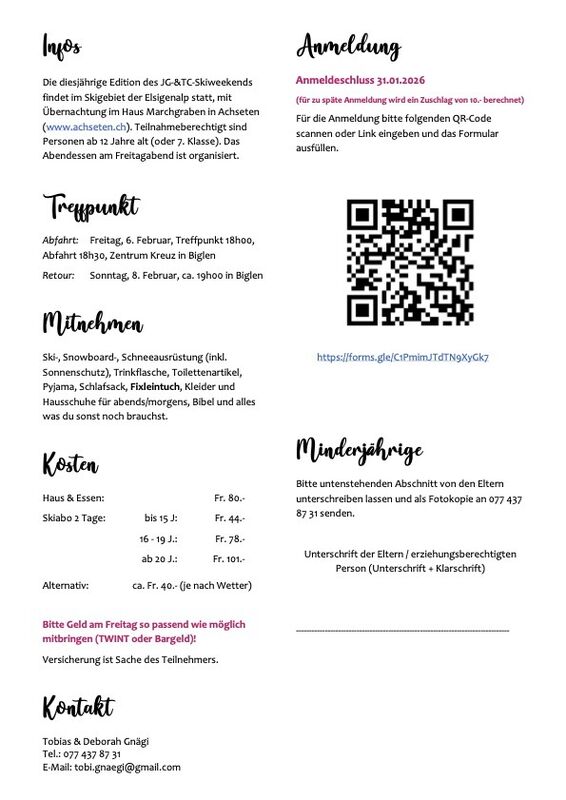 Die diesjährige Edition des JG-&TC- Schneewochenende findet im Skigebiet der Elsigenalp statt, mit Übernachtung im Haus Marchgraben in Achseten (www.achseten.ch). Teilnahmeberechtigt sind Personen ab 12 Jahre alt (oder 7. Klasse). Das Abendessen am Freitagabend ist organisiert.