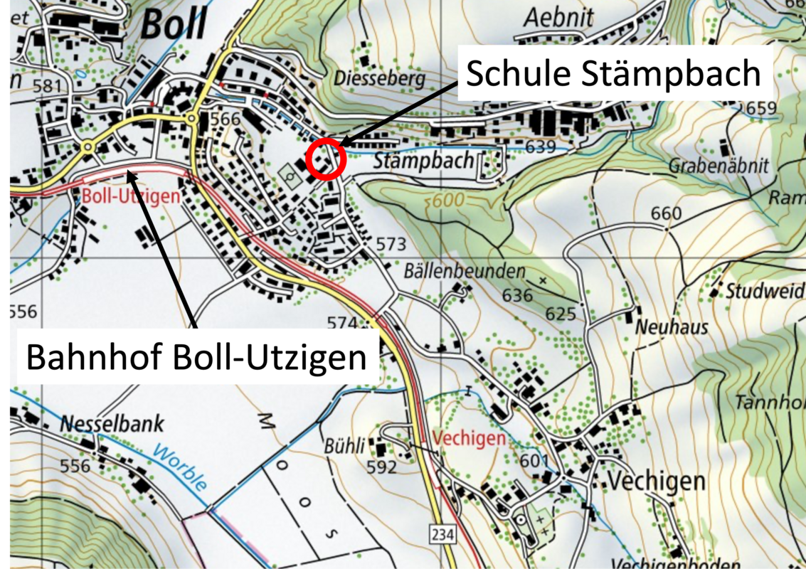 Treffpunkt ist der Veloständer beim Schulhaus Stämpach, Boll. Durchführungsort ist der Dachshölzliwald.