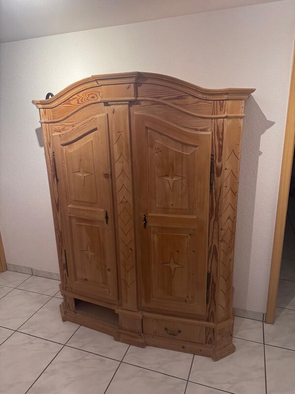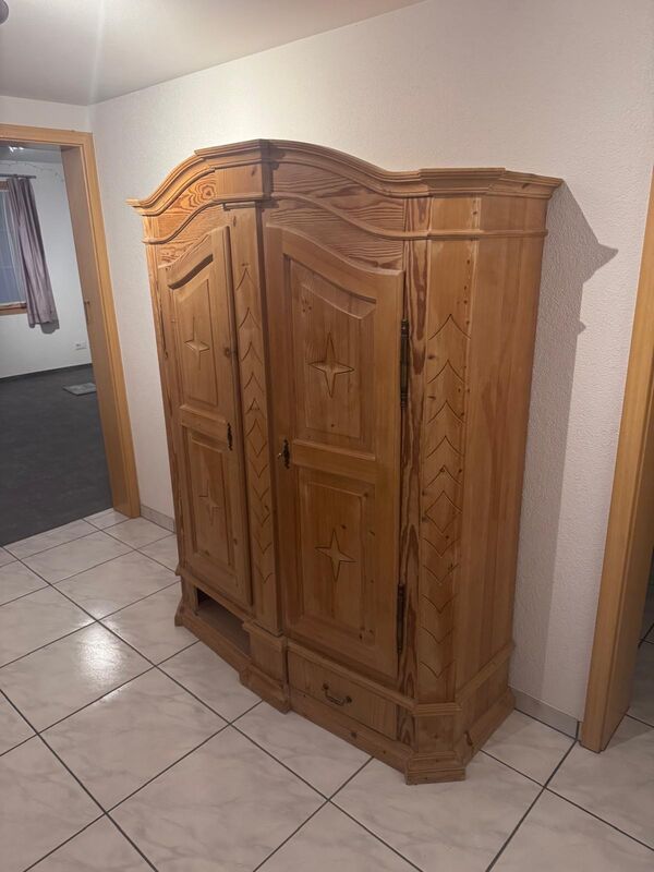 Alter Schrank H 179 cm B 136 cm T 55cm Unten sind keine Schubladen nur Attrappe. Bei der linke Seite müsste es wieder angeleimt werden. Gratis muss in Schlosswil abgeholt werden.