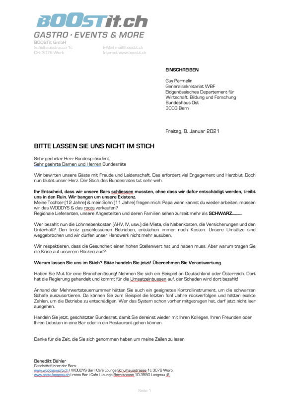 "Ihr Entscheid, dass wir unsere Bars schliessen mussten, ohne dass wir dafür entschädigt werden, treibt uns in den Ruin. Wir bangen um unsere Existenz", schreibt Geschäftsführer Bänz Bähler in seinem Brief an den Bundespräsidenten Guy Parmelin. Im Schreiben legt er die schwierige Situation der Branche dar und bittet die Regierung um finanzielle Unterstützung. Bähler betont, dass die Gesundheit einen hohen Stellenwert haben muss und fragt gleichzeitig: "Warum lassen Sie uns im Stich?"
