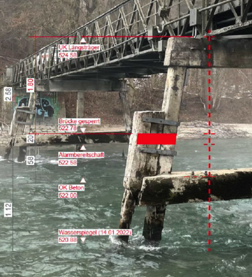Der Auftrag für den Ersatz der Schalung sei schon raus, die Reparatur erfolge im Frühling, wenn das Wasser tief sei. Sicherheitshalber wird bei Hochwasser nun aber bereits gehandelt: "Liegt der Wasserspiegel 1.8 Meter unterhalb der Unterkante der Brücke, wird sie gesperrt." Dann sei noch gewährleistet, dass ein im Wasser treibender Baum unter der Brücke durchpasse.