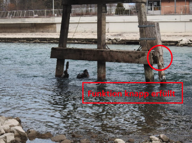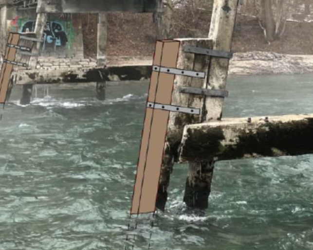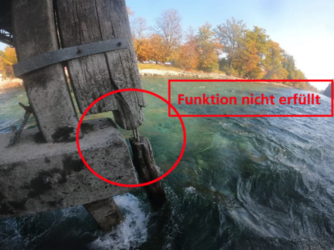Prallt Treibgut in die Brückenpfeiler, so verhindert der Anprallschutz, dass die Brücke beschädigt wird. Dabei handelt es sich um eine Holzverschalung, die die Brückenpfeiler schützt. Wie Gemeinderätin Thekla Huber am Dienstag in der Parlamentssitzung erklärte, ist diese Verschalung mittlerweile teilweise ganz weg, nachdem sie sich bereits bei Untersuchungen 2018 als lädiert erwies. "Die Sicherheit ist nicht mehr gewährleistet", sagte Huber. Denn: "Der seitliche Druck ist ein grosses Problem. Wenn ein Baum kommt und es Querkräfte gibt, wird es gefährlich."