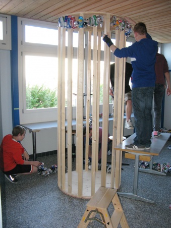 Mitrealisiert wurde das Projekt durch die Schreinerei Kilchenmann in Worb. Das Unternehmen zimmerte aus Dachlatten das 2,5 Meter hohe Holzgerüst für die Rüfenachter Klasse. Die Schülerinnen und Schüler haben anschliessend die Dosen auf Radstücke aufgefädelt und aufgehängt, so dass das Gerüst mehrheitlich bedeckt war. "Die Dose" war entstanden.
