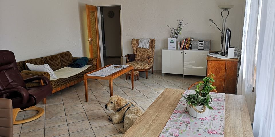 Gino, der Hund, ist der Erste, der die Gäste am Finkenweg 32 in Münsingen begrüsst. Er ist freundlich, nicht stürmisch. Und das ist wichtig. "Ich habe ihm beigebracht, dass er nicht an Personen hochspringt. Rollatoren kennt er", sagt seine Besitzerin Verena Specker. Sie ist langjährige Pflegefachfrau. Den 10-jährigen Gino hat sie schon von klein auf zu ihren Einsätzen mitgenommen, er ist den Umgang mit betagten oder kranken Menschen gewöhnt.
