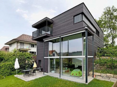 Das moderne Holzhaus etwas oberhalb des Dorfes Münsingen, zwischen Bern und Thun gelegen, fällt sofort auf. Links und rechts eingerahmt von stattlichen Villen aus dem Beginn des letzten Jahrhunderts, präsentiert es sich in einer Art Würfelform. Zehn Meter hoch und mit einer riesigen Glasfront gegen Süden und Südwesten ausgerichtet. Sonst aber deutet nichts darauf hin, dass es sich hier um eines der ersten Plusenergie-häuser der Schweiz handelt, ausgezeichnet mit dem Norman Foster Solar Award 2011.