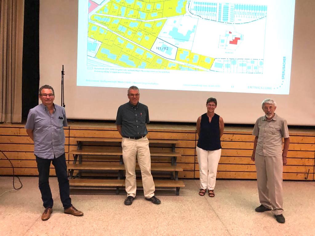 Kirchgemeinderatspräsident Werner Lüthi, Theo Schmid, Kirchgemeinderat mit dem Ressort Liegenschaften, Raumplaner Res Wyss und Architekt und Kirchenmitglied Stefan Gauer präsentierten die Vorlage. In einem Workshopverfahren soll ein Auftrag an potentielle Planer*innen und Investor*innen entwickelt werden. Einige Eckpfeiler sind in der Vorlage enthalten, vieles ist noch offen. Klar ist, dass es Wohnungen geben soll, dass die Kirchgemeinde weiterhin Raum haben und dass sie das Land nicht verkaufen, sondern im Baurecht abgeben und bei der Planung mitreden will. Nicht zuletzt, um auch ihre ökologischen und sozialen Ansprüche an die zukünftige Nutzung einbringen zu können. Erhalten blieben möglicherweise nur der Glockenturm und das Ofenhaus.
